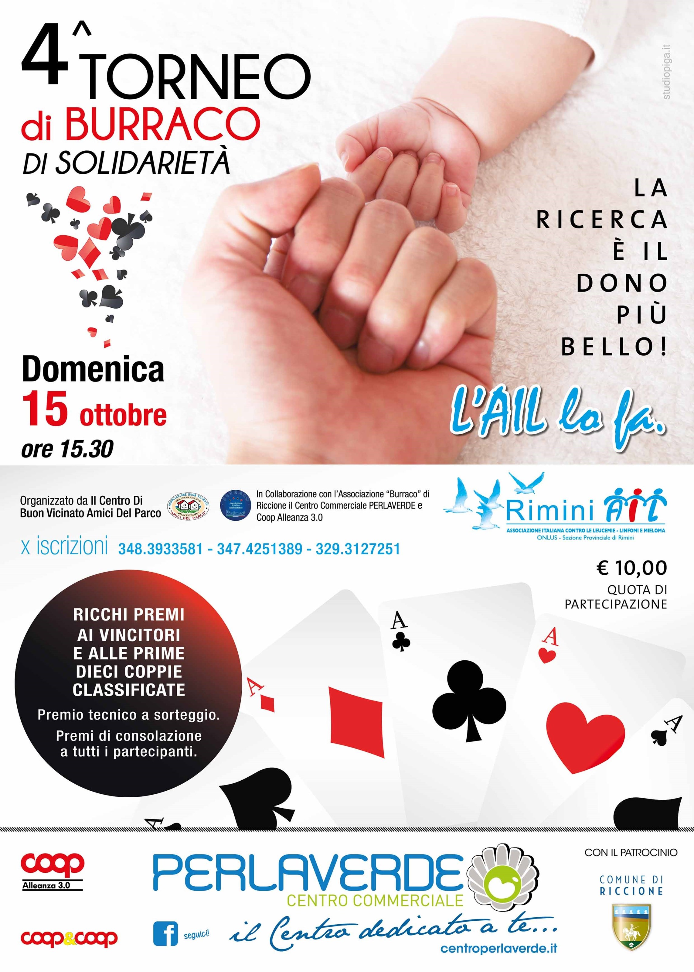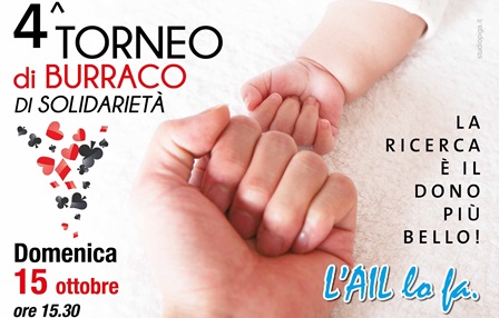 Domenica 15 ottobre torna il torneo di burraco nella galleria del centro commerciale PerlaVerde. L'iniziativa è a scopo benefico e il ricavato sarà devoluto a RIMINI AIL, l’associazione italiana contro le leucemie-linfomi e mieloma.