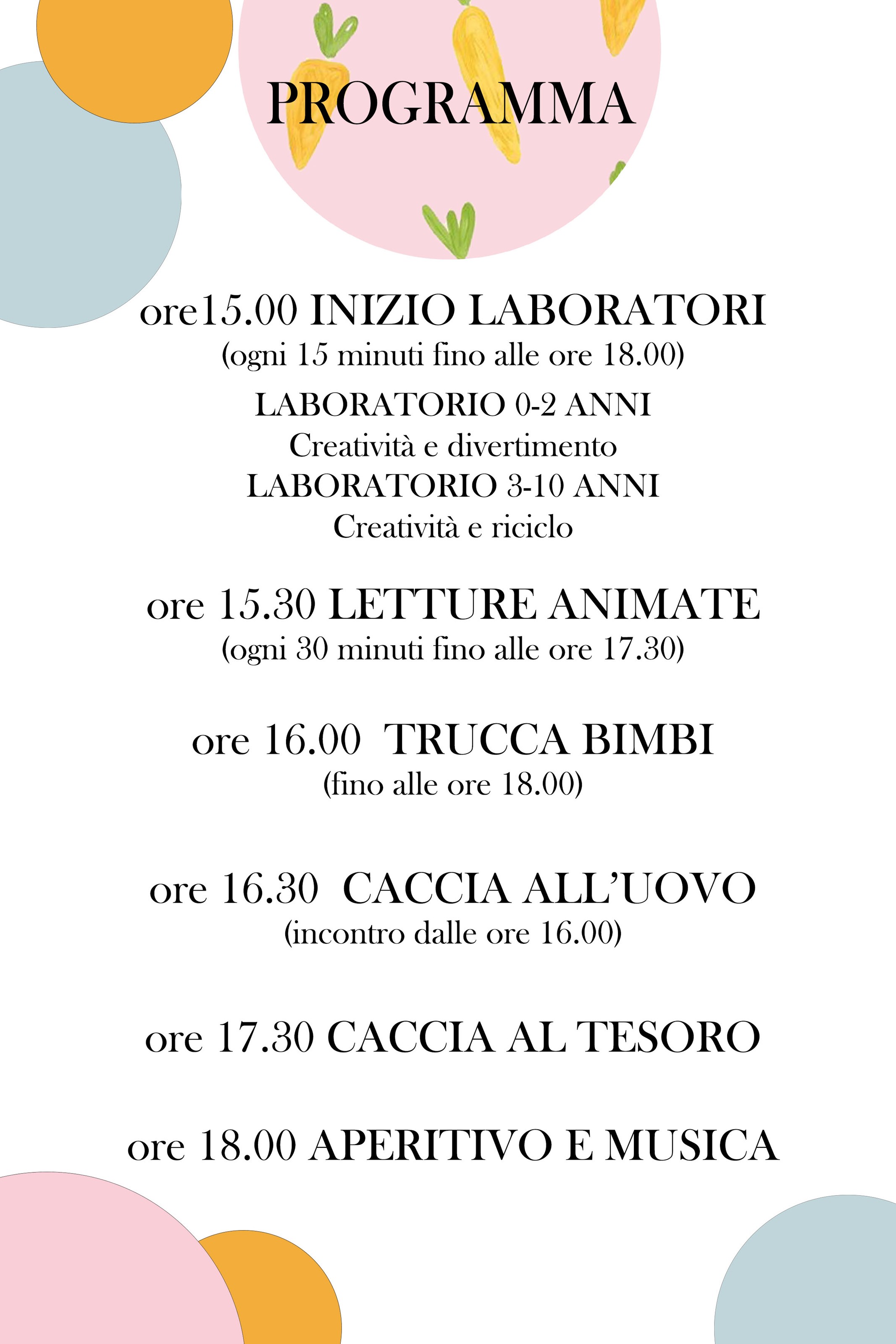Il pomeriggio della Domenica delle Palme è allietato anche dai laboratori a tema pasquale e primaverile. Dalle ore 15:00 e fino alle 18:00, si terranno alcuni laboratori creativi organizzati per fascia d’età: Creatività e divertimento per i più piccini fino ai due anni, Creatività e riciclo per i giovani ospiti di età compresa tra i 3 e i 10 anni che si cimenteranno nel giardinaggio e in altre abilità utilizzando materiali destinati al macero. Il divertimento prosegue con le letture animate e lo spazio trucca bimbi.