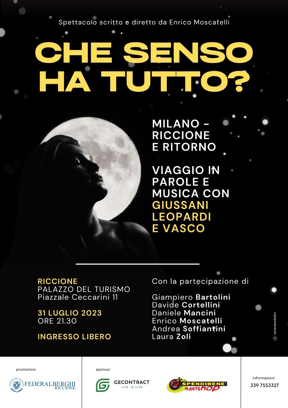Lunedì 31 luglio (ore 21:30), piazzale Ceccarini ospita l’evento Che senso ha tutto? Milano - Riccione e ritorno. Viaggio in parole e musica con Giussani, Leopardi e Vasco, un incontro aperto al pubblico durante il quale si leggeranno brani di Luigi Giussani e Giacomo Leopardi, accompagnati da canzoni live di Vasco Rossi che insieme condividono il tema suggerito sulle domande fondamentali legate alla vita.