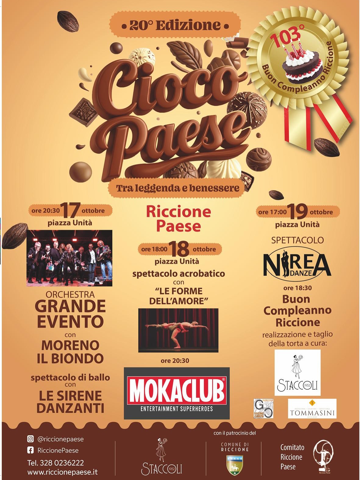 Riccione è pronta a celebrare i suoi 103 anni di Comune autonomo: un lungo weekend di festeggiamenti prenderà il via venerdì 17 ottobre e proseguirà fino al giorno del compleanno, domenica 19 ottobre. Una grande festa collettiva, nata da un progetto culturale corale che unisce due eventi simbolo della programmazione autunnale: CiocoPaese, la manifestazione che celebra l’enogastronomia e la tradizione nel cuore storico della città, Sogna Riccione Sogna, l’iniziativa artistica e culturale dedicata alle nuove generazioni. Un unico, grande augurio di Buon compleanno Riccione che si diffonde da Riccione Paese fino al mare, promosso dall’Amministrazione comunale in collaborazione con scuole, associazioni, comitati e realtà del territorio.