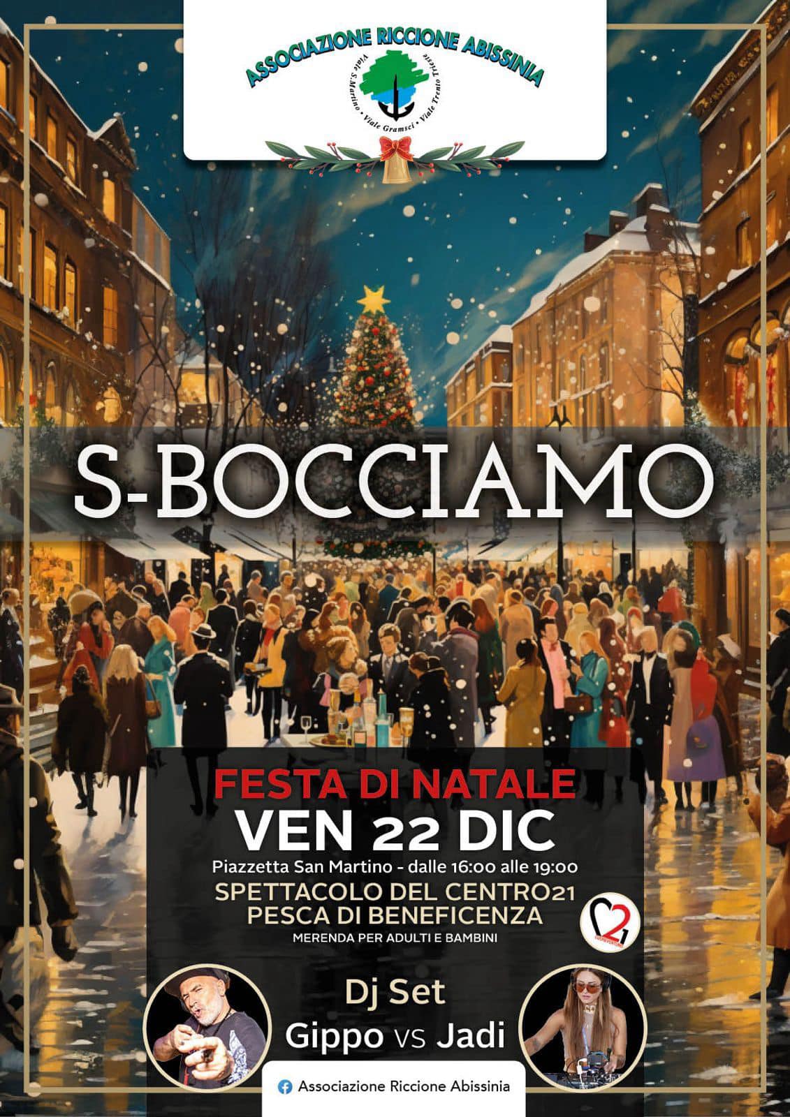 Venerdì 22 dicembre l’Associazione Abissinia invita alla Festa di Natale, in piazzetta San Martino dalle ore 16:00 alle 21:00. La bella festa per scambiarsi gli auguri è organizzata con i ragazzi del Centro 21, interpreti di uno spettacolo di danza e musica, accompagnato dal dj set Gippo vs Jadi, cui seguirà la pesca di beneficenza e una gustosa merenda per tutti.