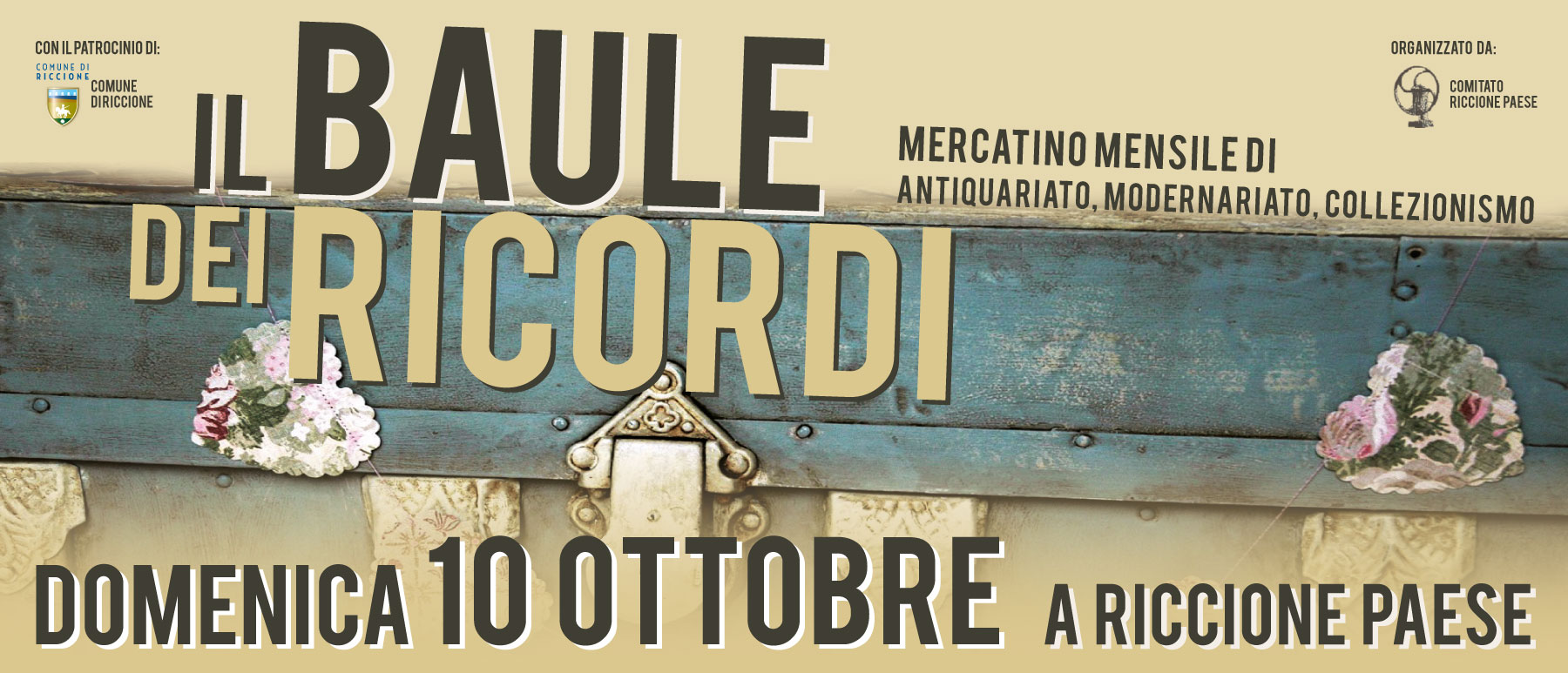 Dal mese di ottobre e fino all’inizio dell’estate, ogni seconda domenica del mese, Riccione Paese si anima con le bancarelle de Il Baule dei ricordi, il mercatino del riuso dove poter trovare oggetti rari o dimenticati, articoli curiosi, piccolo antiquariato e modernariato, monete e banconote, bigiotteria, bronzi, calendari, carte geografiche, cartoline, quadri, ceramiche e vetri, chiavi, dischi in vinile, filatelia e storia postale, fotocamere, fumetti, giocattoli, libri antichi, macchine da scrivere, orologi, porcellane, santini, stampe d’epoca, strumenti musicali e tanto altri oggetti che tornano a nuova vita in un’ottica di consumo più sostenibile.