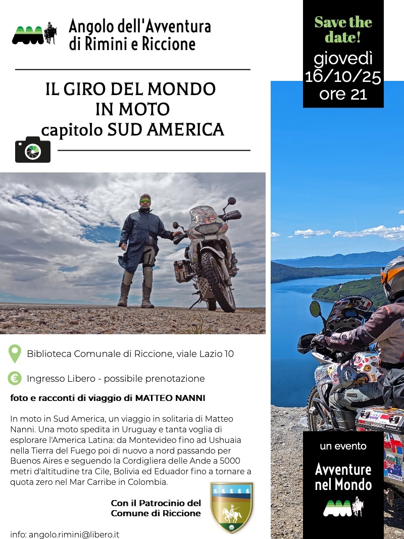 16 ottobre 2025 - Il giro del mondo in moto: capitolo Sud America, di Matteo Nanni - scarica la locandina