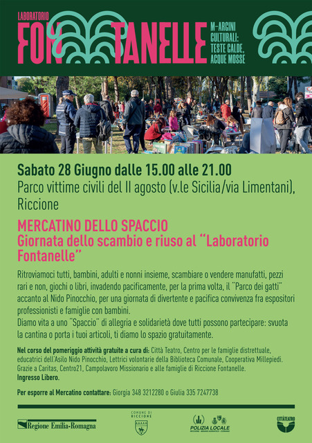 Sono aperte le prenotazioni per partecipare al Mercatino dello Spaccio - Giornata dello Scambio e del Riuso, in programma sabato 28 giugno dalle ore 15.00 alle 21.00 presso il Parco Vittime Civili del II Agosto (viale Sicilia / via Limentani), nel cuore del quartiere Fontanelle.