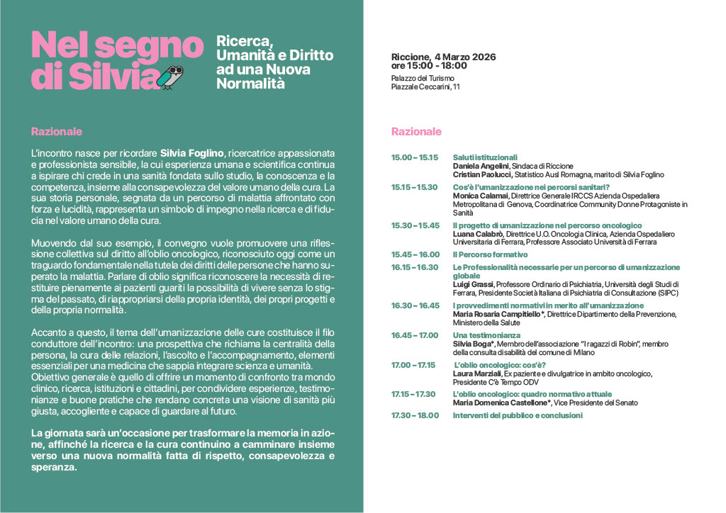 L’appuntamento nasce per ricordare Silvia Foglino, ricercatrice appassionata e professionista sensibile, la cui esperienza umana e scientifica continua a ispirare chi crede in una sanità fondata sullo studio, la conoscenza e la competenza, insieme alla consapevolezza del valore umano della cura. La sua storia personale, segnata da un percorso di malattia affrontato con forza e lucidità, rappresenta un simbolo di impegno nella ricerca e di fiducia nel valore umano della cura. Muovendo dal suo esempio, il convegno vuole promuovere una riflessione collettiva sul diritto all’oblio oncologico, riconosciuto oggi come un traguardo fondamentale nella tutela dei diritti delle persone che hanno superato la malattia, affinché possano riappropriarsi della propria identità e dei propri progetti senza lo stigma del passato. Al centro dell’incontro anche il tema dell’umanizzazione delle cure: una prospettiva che richiama la centralità della persona, la cura delle relazioni, l’ascolto e l’accompagnamento, elementi essenziali per una medicina che sappia integrare scienza e umanità.