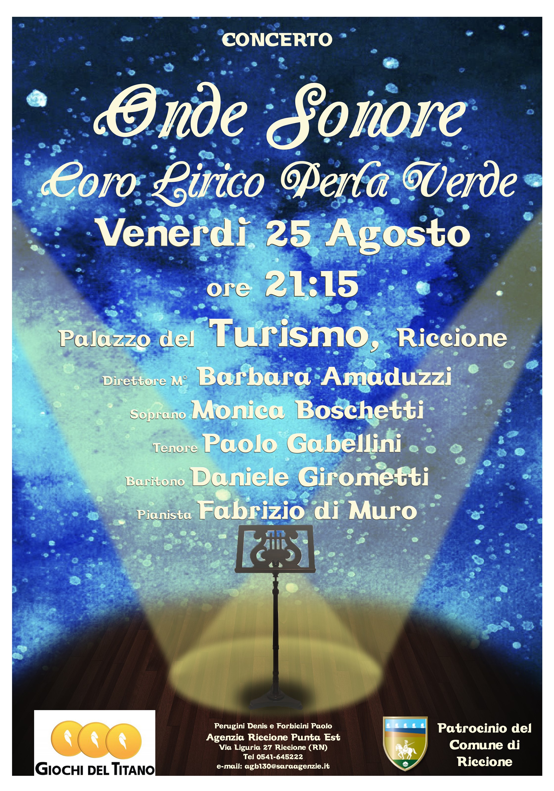 Una serata all’insegna delle grande musica sulle note delle più belle arie del Belcanto italiano: il Coro Lirico Perla Verde di Riccione si esibirà in concerto in piazzale Ceccarini, antistante il Palazzo del Turismo, venerdì 25 agosto con inizio alle ore 21.15. In programma alcune delle arie più belle della grande tradizione musicale italiana, dalla Traviata al Trovatore di Giuseppe Verdi, dalla Carmen di George Bizet al grande repertorio dell’operetta. Per l’occasione l’ensemble corale riccionese, diretta dalla maestra Barbara Amaduzzi, sarà affiancata da affermati cantanti solisti: il soprano Monica Boschetti, il tenore Paolo Gabellini, il baritono Daniele Girometti; al pianoforte il maestro Fabrizio di Muro.