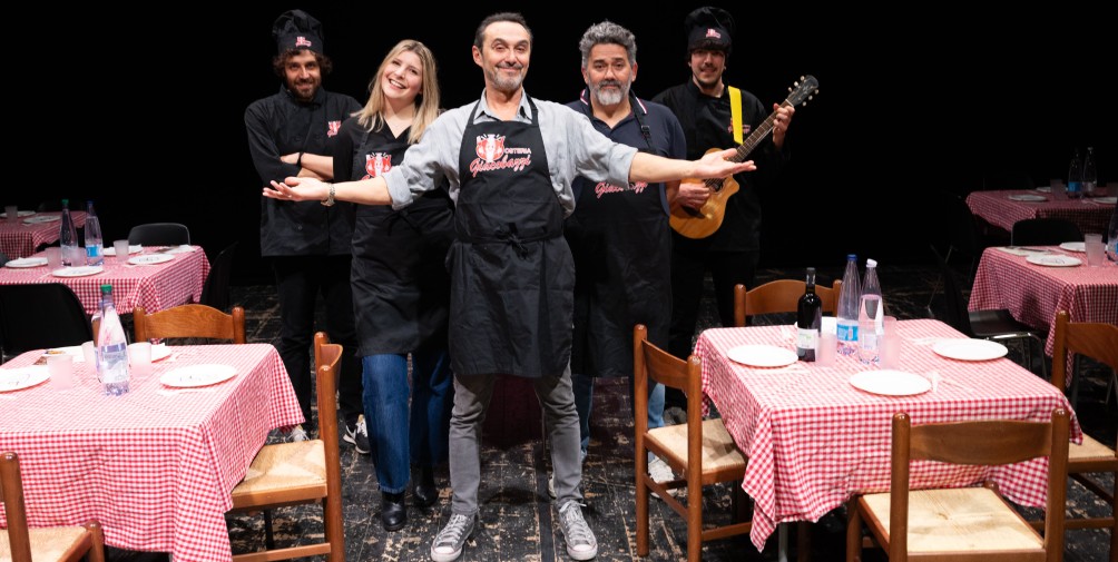 In Osteria Giacobazzi il palco si trasforma in una vera e propria osteria: tavoli imbanditi, vino e vettovaglie serviti durante lo spettacolo ad ospiti che, seduti sul palco, mangiano e bevono durante lo show. Un’esperienza teatrale immersiva e unica nel suo genere. Giuseppe Giacobazzi, a capo di una brigata straordinaria, garantisce oltre due ore di risate continue.