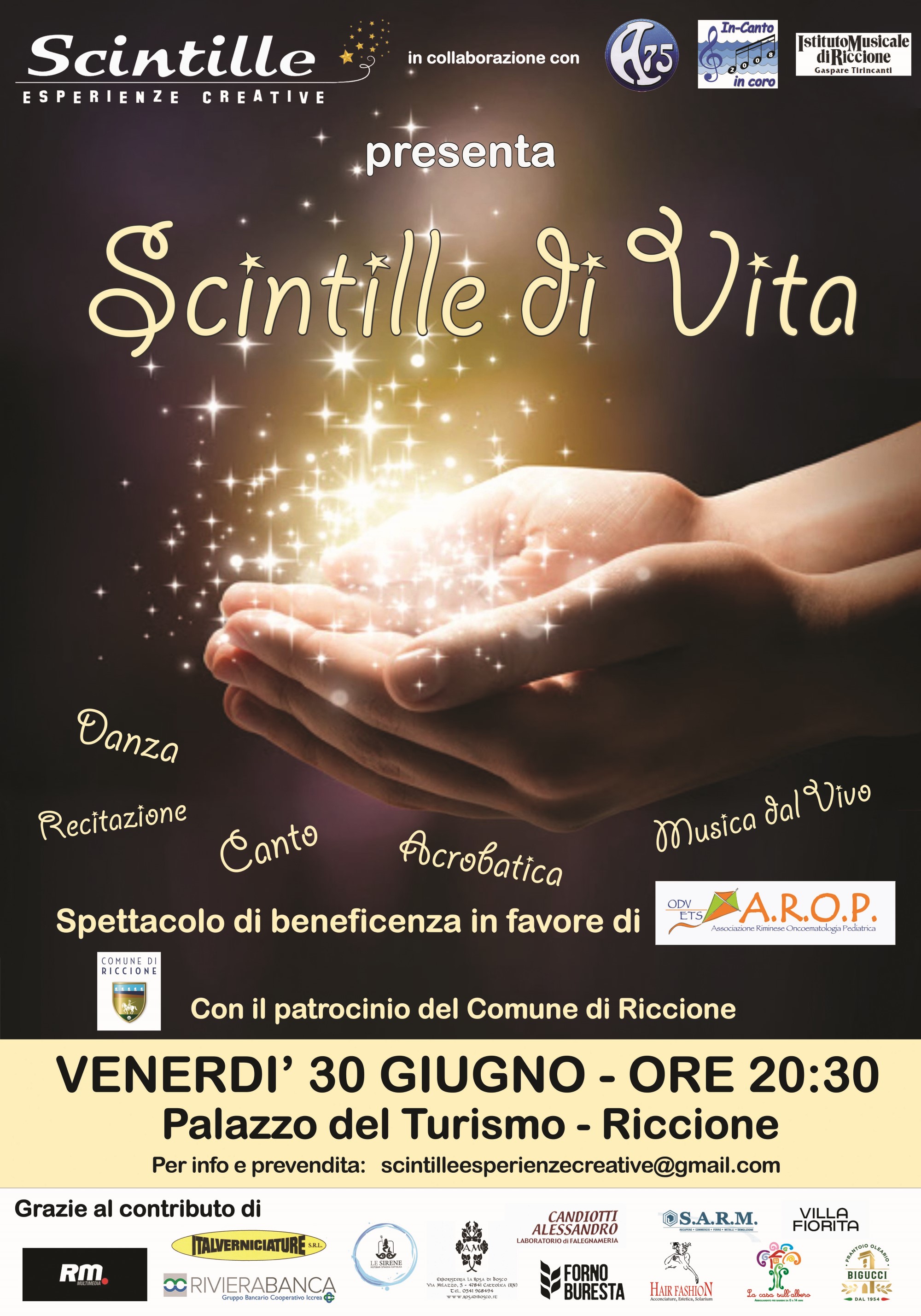 Lo spettacolo è a scopo benefico e il ricavato della serata sarà devoluto all’associazione A.R.O.P., che si occupa di finanziare le necessità del reparto oncologico pediatrico dell’ospedale di Rimini.